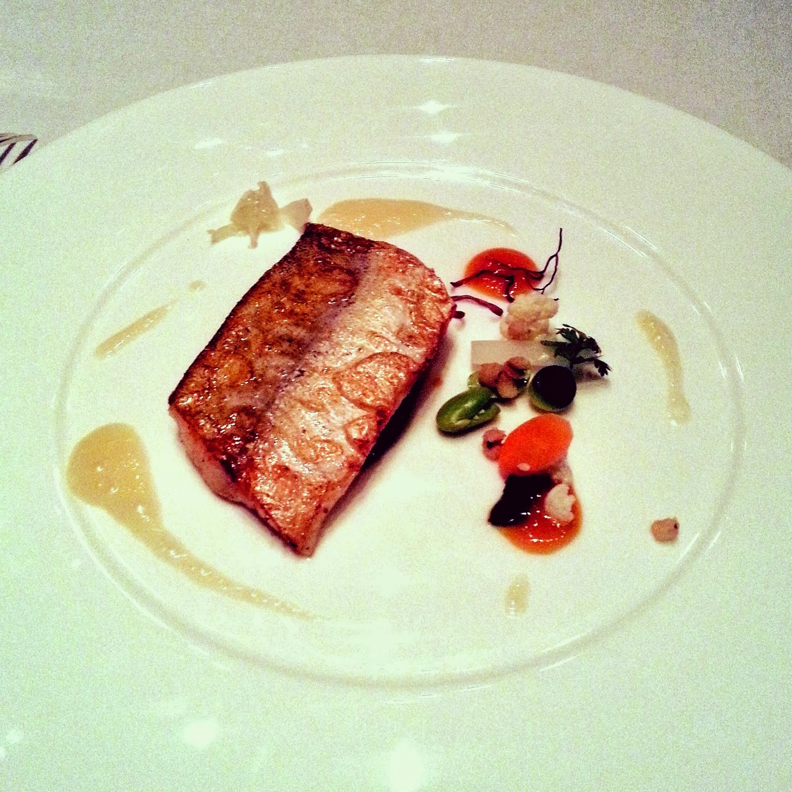 Our second course was yellow fin tuna, smoked salmon mousse, togarashi and lemon caviar. Described as one of the highlights of the evening, this was easily my favourite course of the night. The tuna was heavenly and melted in your mouth but it was the spiced nougatine on top that made this dish a revelation. The delicate snap and the sweetness of the nougatine paired with the tenderness of the tuna was an unusual but genius combination.